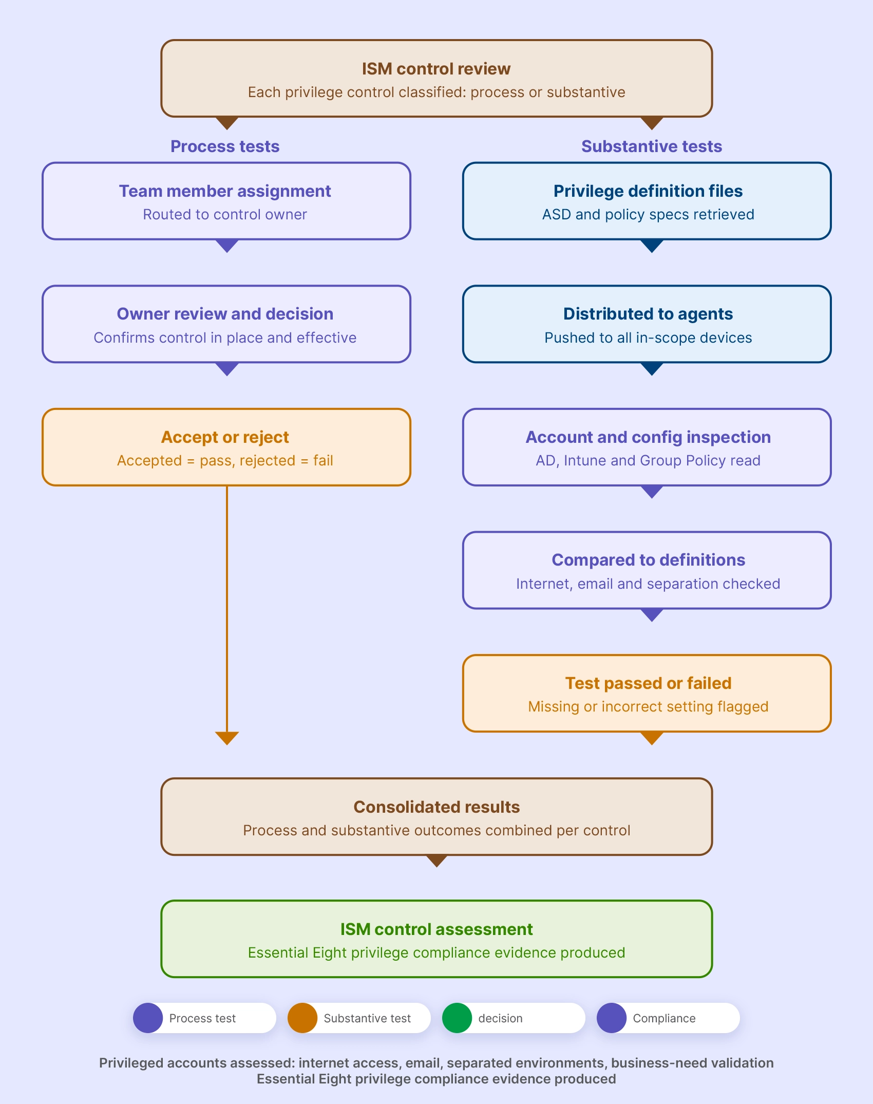 This approach enables organisations to validate that privilege management has been deliberately planned and implemented, identify accounts or configurations that fall outside policy, assess alignment with Essential Eight maturity requirements, and produce clear, audit-ready evidence of privileged access governance.