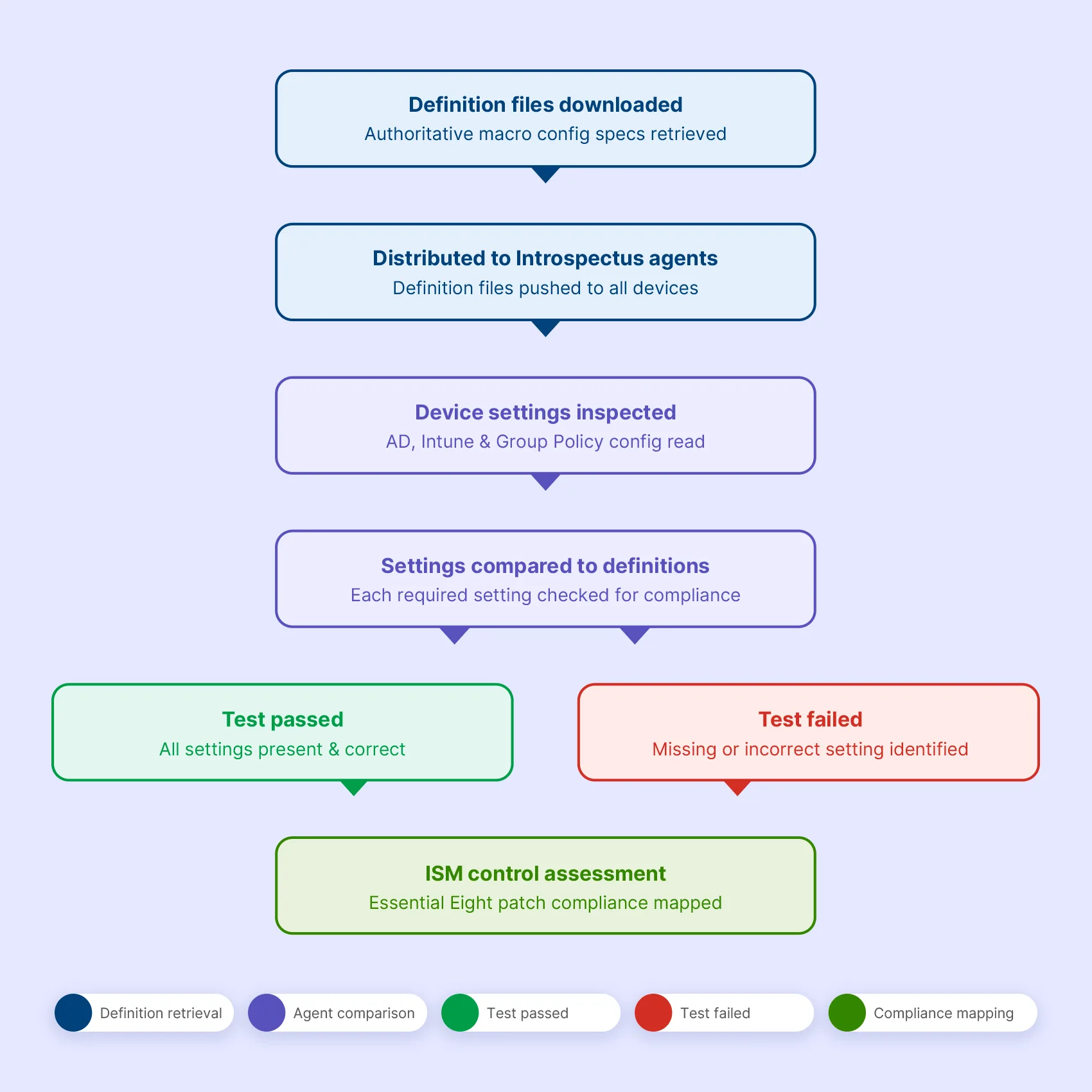 The Introspectus agent downloads the latest definition files and compares them against the macro-related settings present on each device. Every required setting is checked: whether macros are disabled for standard users, whether internet-sourced macros are blocked, whether antivirus scanning is active, and whether users are prevented from overriding these controls.