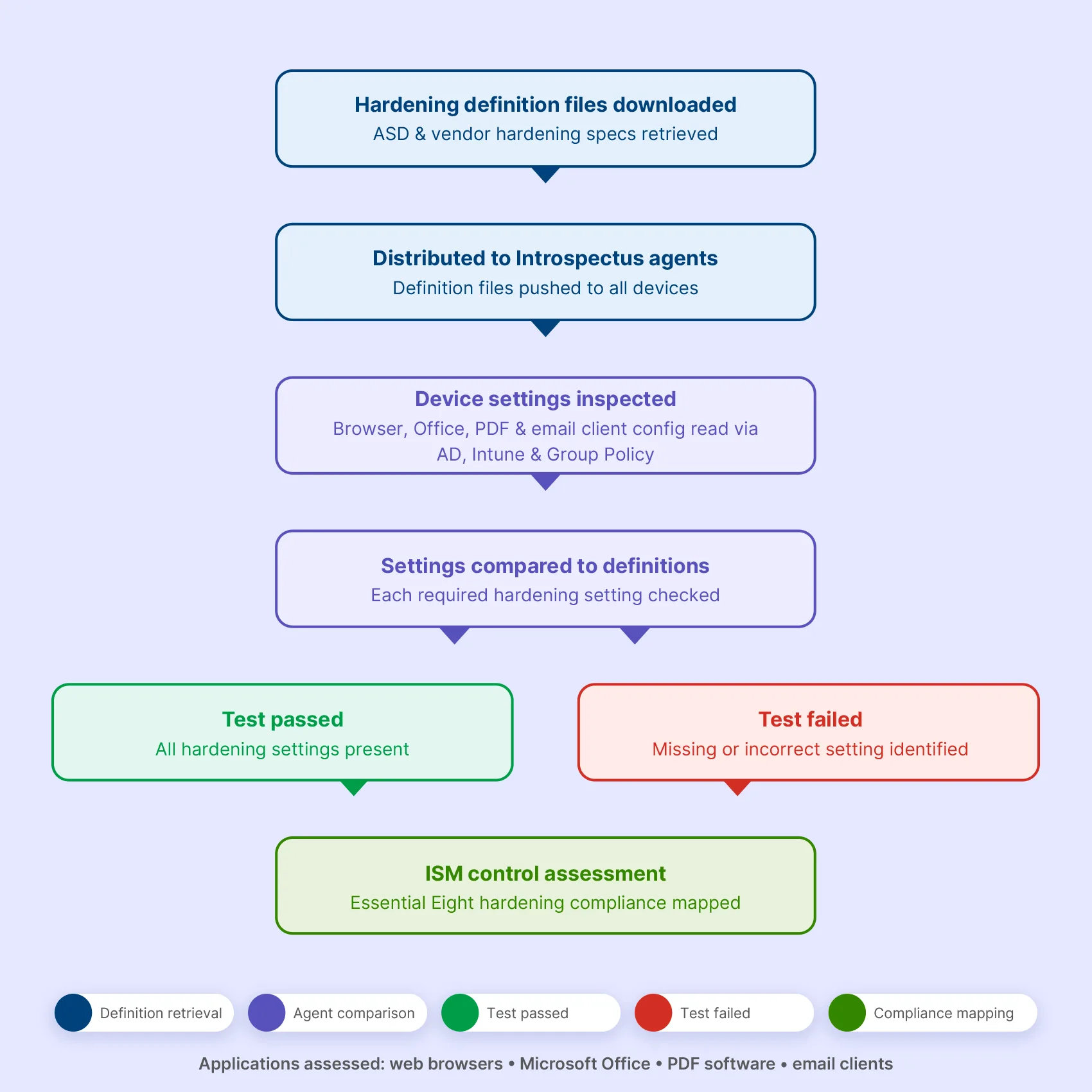 The agent downloads a curated set of definition files authoritative specifications of how hardening settings should be configured across browsers, Office applications, PDF software and related tools, aligned to ASD and vendor hardening guidance.